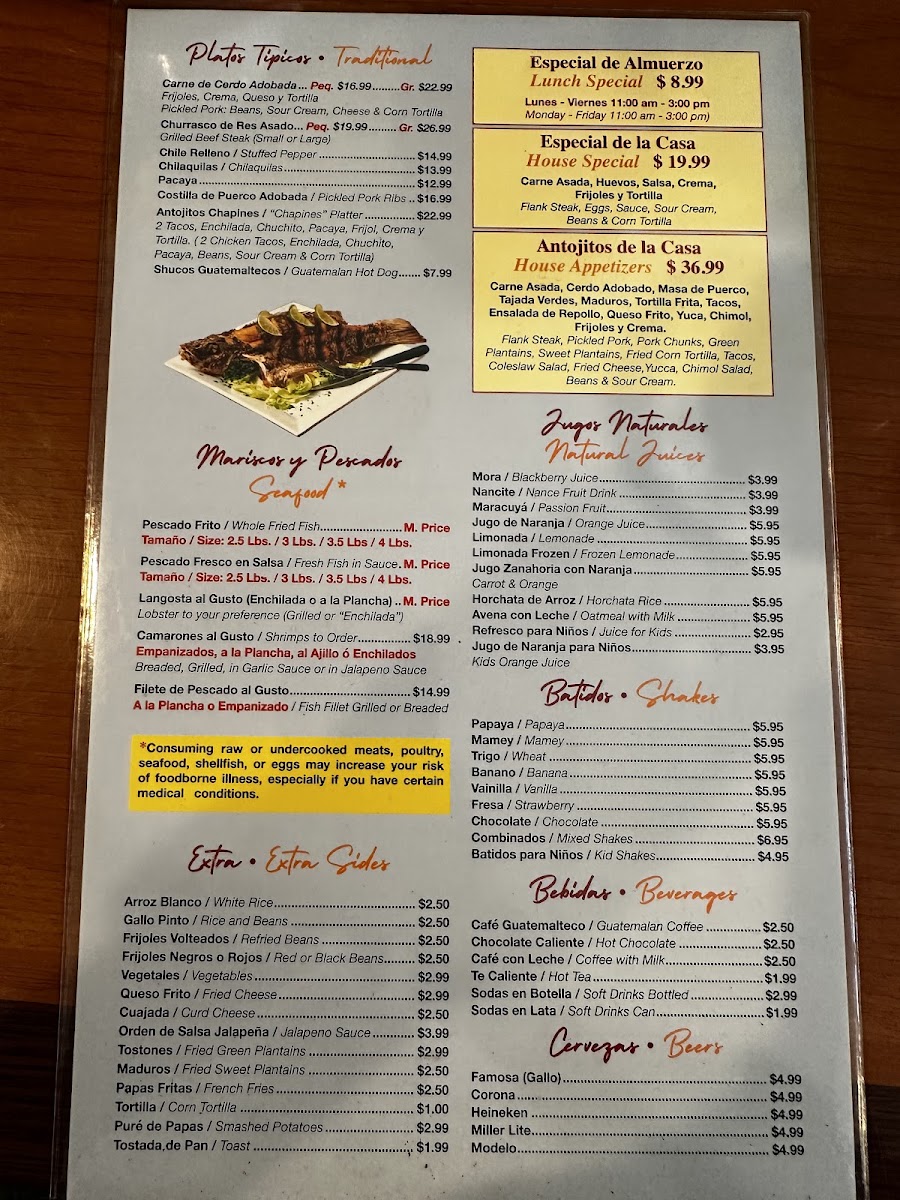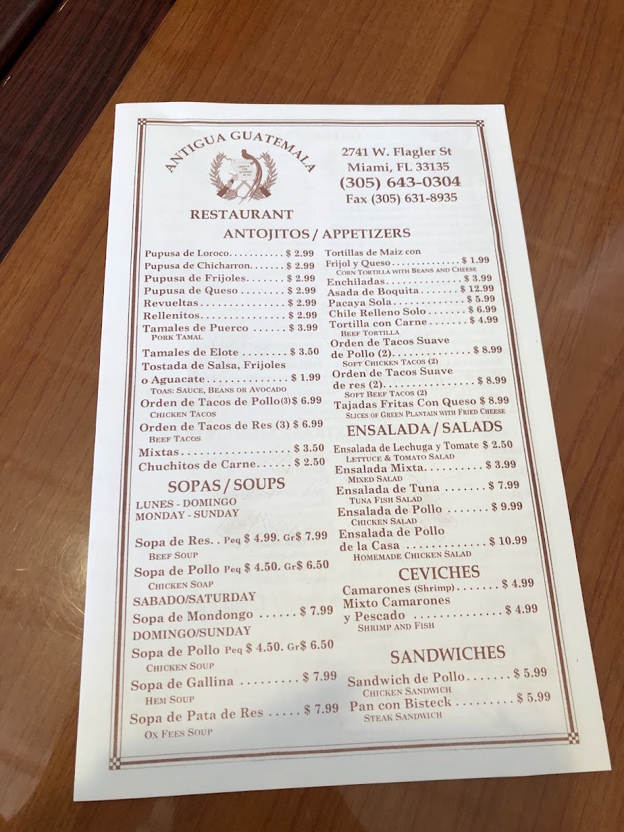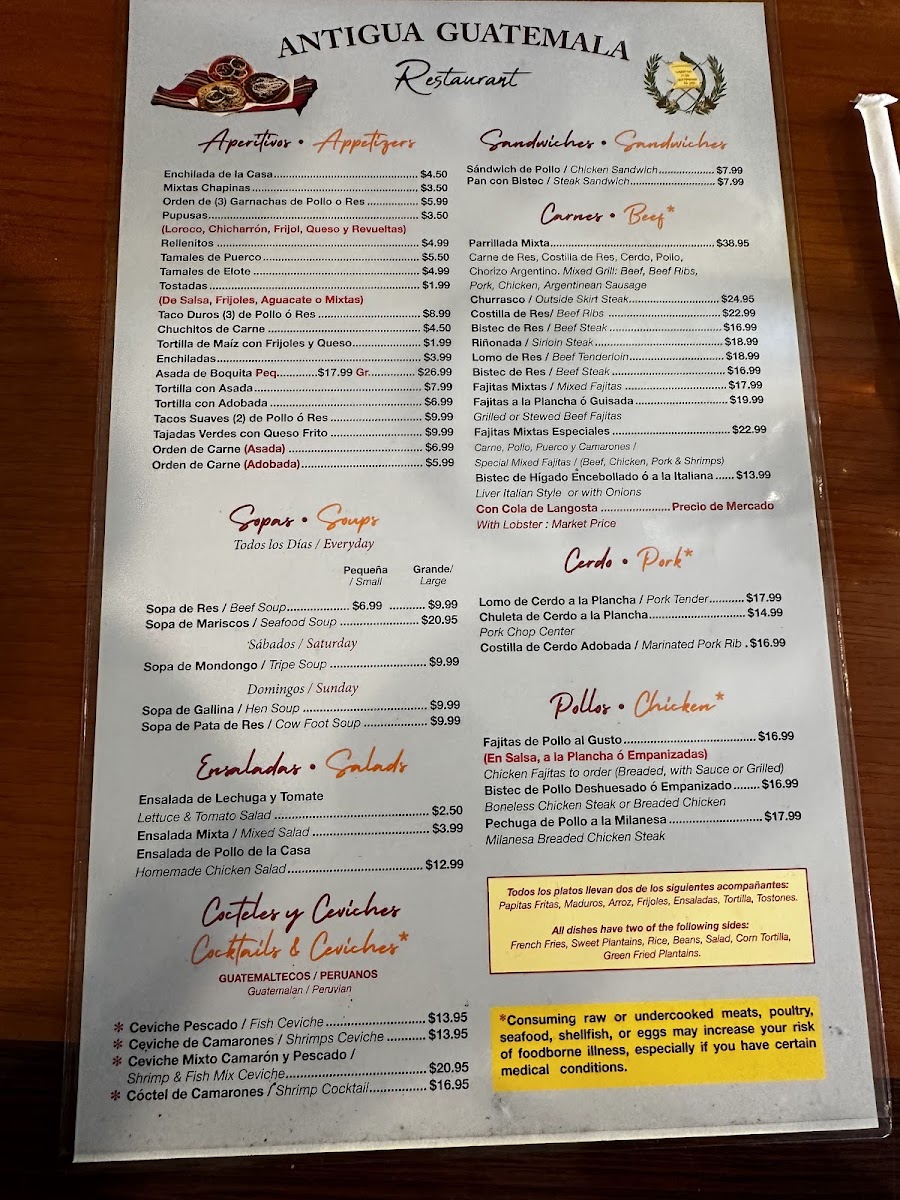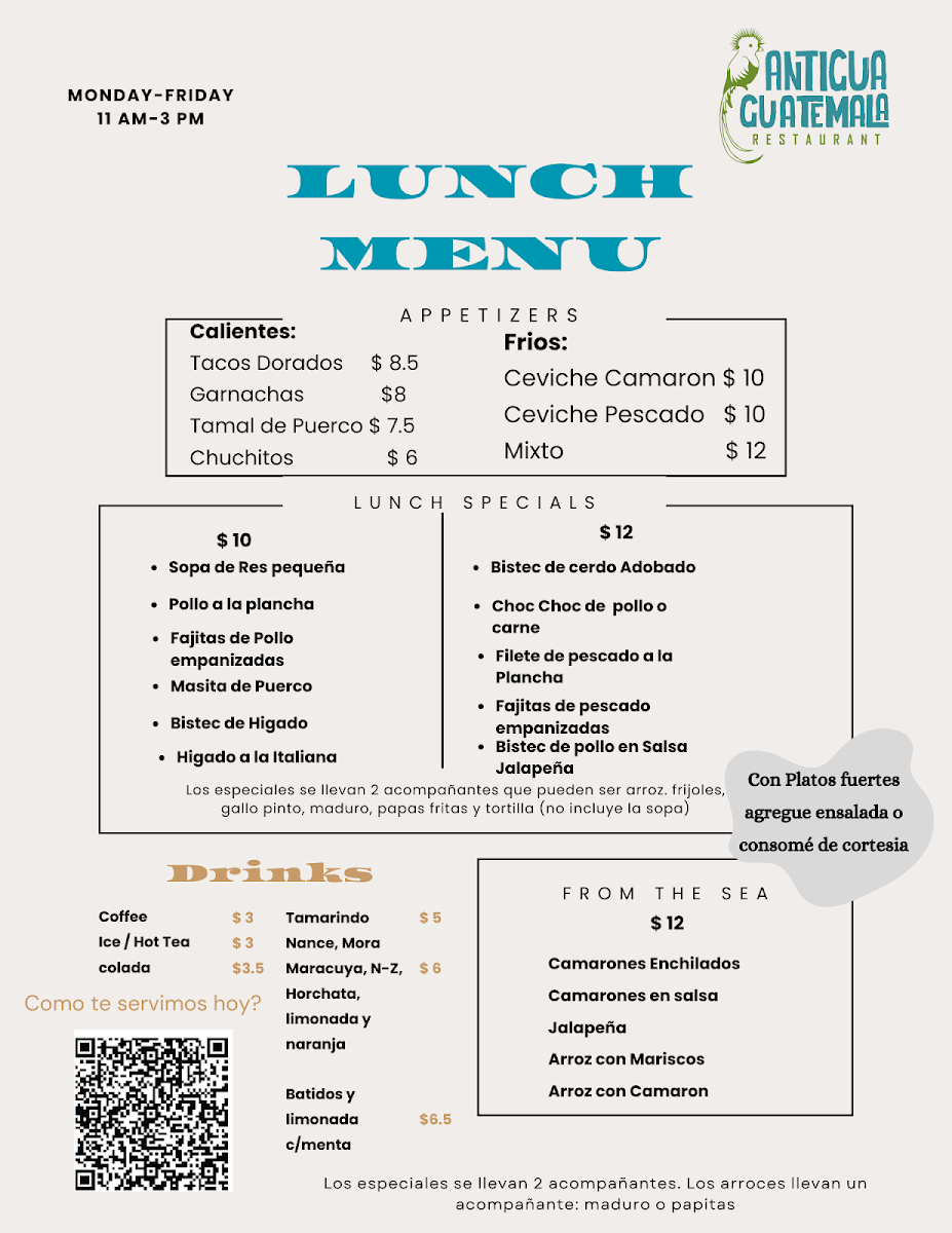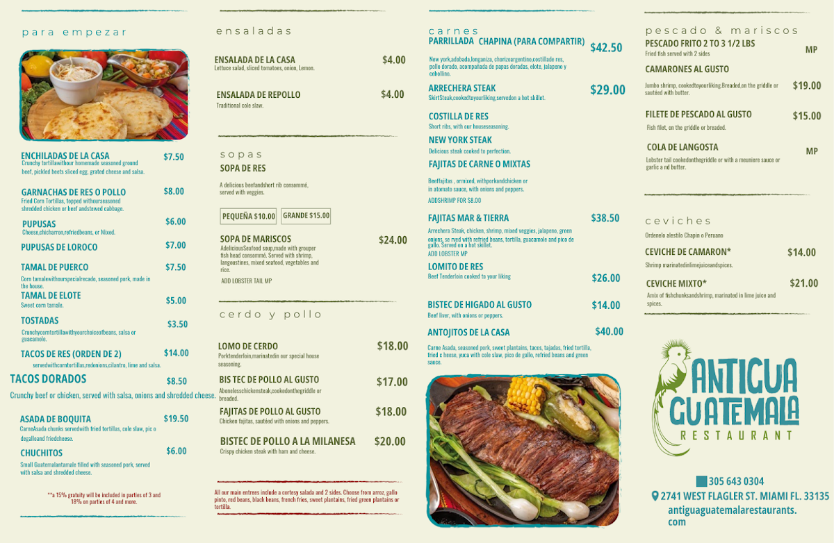 The menu at Antigua Guatemala Restaurant offers a welcoming blend of traditional Guatemalan dishes served in a relaxed, casual setting. You’ll find a thoughtful selection of comforting meals and snacks that bring a taste of home-style cooking, perfect for lunch, dinner, or even a leisurely weekend gathering.