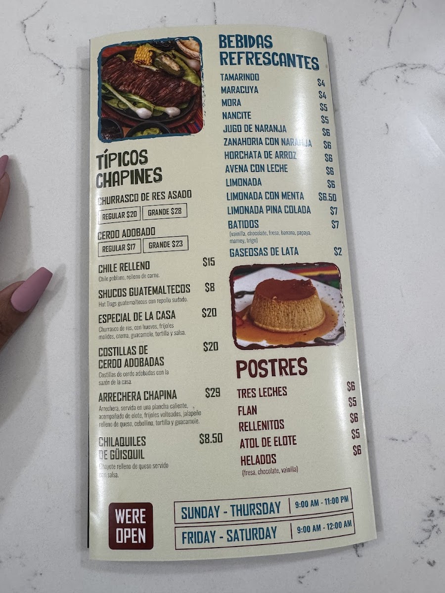 The drink offerings complement the flavors beautifully, featuring traditional refreshments like Horchata de Arroz and regional favorites such as Guatemalan beer El Gallo. For a simple, satisfying finish, the dessert options highlight classics like Flan and Rellenitos, alongside a small coffee menu showcasing robust Guatemalan brews.